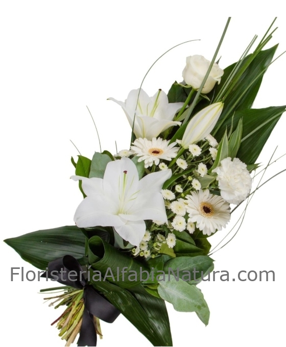 Bonito y fino Ramo Funerario Blanco Detalle Flor para entregar en los Tanatorios de Santa Ponsa. Es un ramo funerario de flores variadas, flores blancas para dar el pésame, confeccionado con rosas, gerberas, claveles, lilium y verdes variados que le dan al ramo funerario un toque dulce y delicado (incluye 1 Rosa, 1 gerbera, 3 lilium, 7 varas de margaritas, verdes variados, celofán, lazo y cinta funeraria). Desde Floristería Alfabia Natura nuestros ramos de flores para funeral se envían a todos los Tanatorios de Santa Ponsa como muestra de cariño, aprecio y acompañamiento para la familia de la persona fallecida. Este ramo de flores en tonos blancos para funeral es un producto de gran calidad, con flores para difuntos variadas frescas suministradas a diario por nuestros proveedores, tanto nacionales como internacionales. Por lo que lo elaboraremos lo más parecido posible o a gusto del cliente. Nuestros trabajos de flores para difuntos, están siempre realizados con flores blancas para dar el pésame de máxima calidad y verdes variados, Son ramos para funeral efectuados de forma totalmente artesanal por Floristería Alfabia Natura. Somos floristas profesionales, por lo que su ramo quedará bonito y elegante.