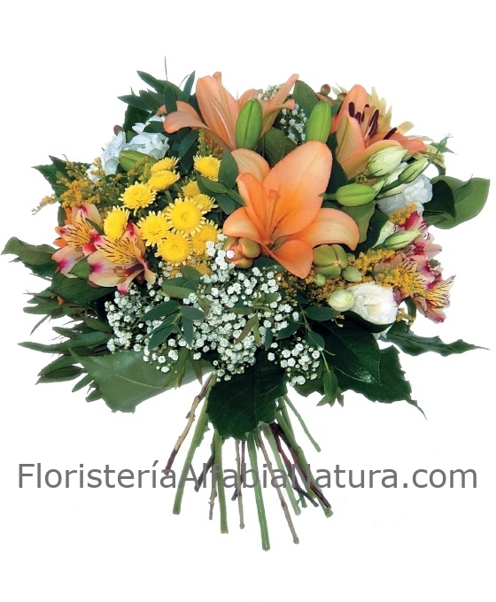 De entre nuestro ramos de flores de temporada, el Ramo Flores Lisboa, realizado en tonos alegres pero que nos reflejan los dulces colores del otoño, aporta un aire romántico y otoñal muy especial. Compuesto por flores silvestres como las margaritas, paniculata, alstromerias, lisianthums, y también por flores más especiales como es el lilium, realizado con colores otoñales y decorado con bonitos verdes que le dan ese aire tan alegre y bonito, que nos aboca al otoño, que es sin duda una estación de colores especiales. Es el ramo de regalo perfecto, que sin duda podemos hacer si lo que queremos es alegrar un día especial. Bonito ramo de flores de regalo que presenta nuestra floristería online, Floristería Alfabia Natura en Santa Ponsa.