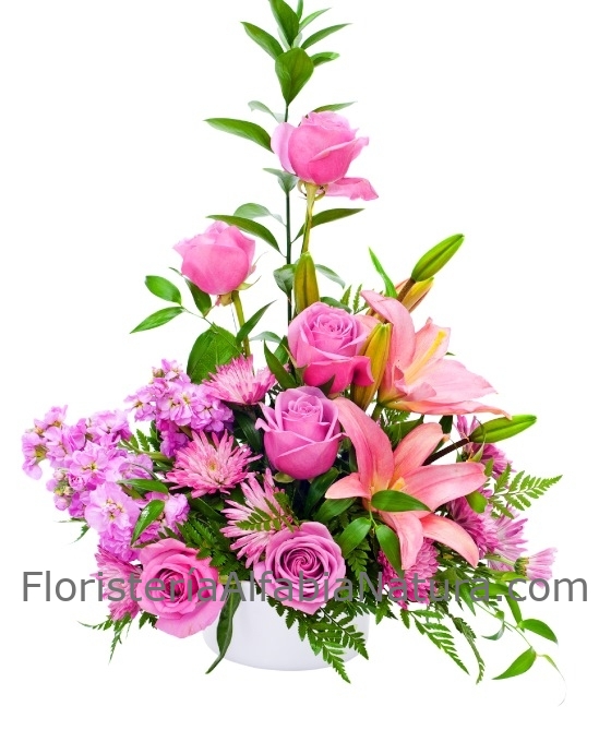 Precioso por sus tonos y muy elegante por sus hermosas flores es este Centro de Rosas y Lilium Rosados. Es un centro de flores de regalo compuesto por algunas de las mejores flores que nos ofrece la naturaleza, como son las rosas rosas para regalar y el lilium, las margaritas, todo ello decorado con hermosos verdes sobre una base de cerámica. En Floristería Alfabia Natura, su floristería online, expertos en el arte floral, podemos ayudarle a hacer el regalo perfecto. Haremos llegar a su ser querido, todo el amor y alegría que quiere demostrar con este bonito centro de rosas a domicilio. Sin duda, lo que quiere es hacer el mejor regalo.