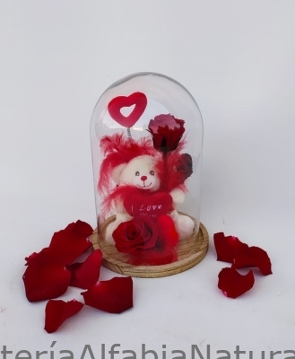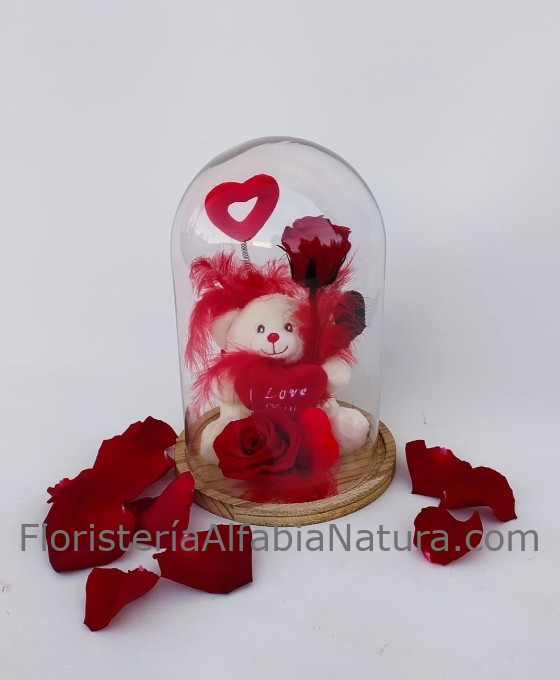 Celebra el día del amor con elegancia y ternura con nuestras exclusiva Cúpula San Valentín, una creación única de la Floristería Jardines Alfaba. Esta cautivadora cúpula combina lo romántico de las Rosas Naturales con la suavidad de un adorable peluche, creando un regalo inolvidable para esa persona especial en tu vida.