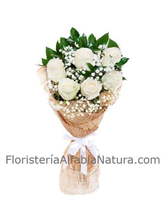 Fino e inmejorable en presencia es este Ramo de 6 Rosas Blancas, realizado con rosas blancas de tallo largo y decorado con paniculata blanca y finos verdes, todo ello envuelto en tela de saca o rafia, que le da a este bonito ramo de rosas blancas de regalo, un aire campestre y primaveral. Regalar rosas, es el regalo perfecto, si lo que queremos es enviar rosas rojas a domicilio. Si buscas rosas blancas para regalar, bien sean rosas blancas para el Día de la Madre o rosas blancas para regalar en nacimientos,en Floristería Alfabia Natura, expertos en el arte floral tenemos los mejorers ramos.